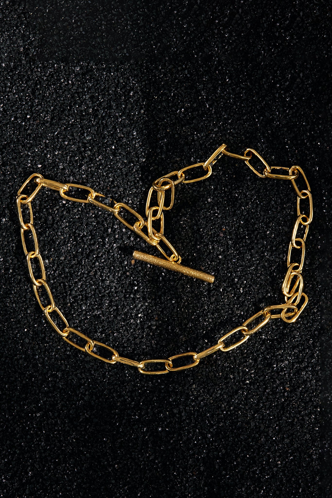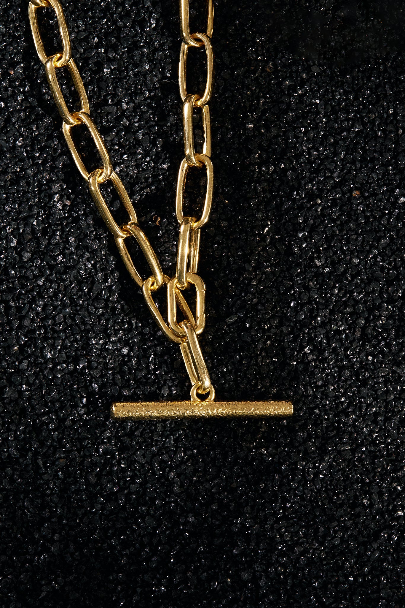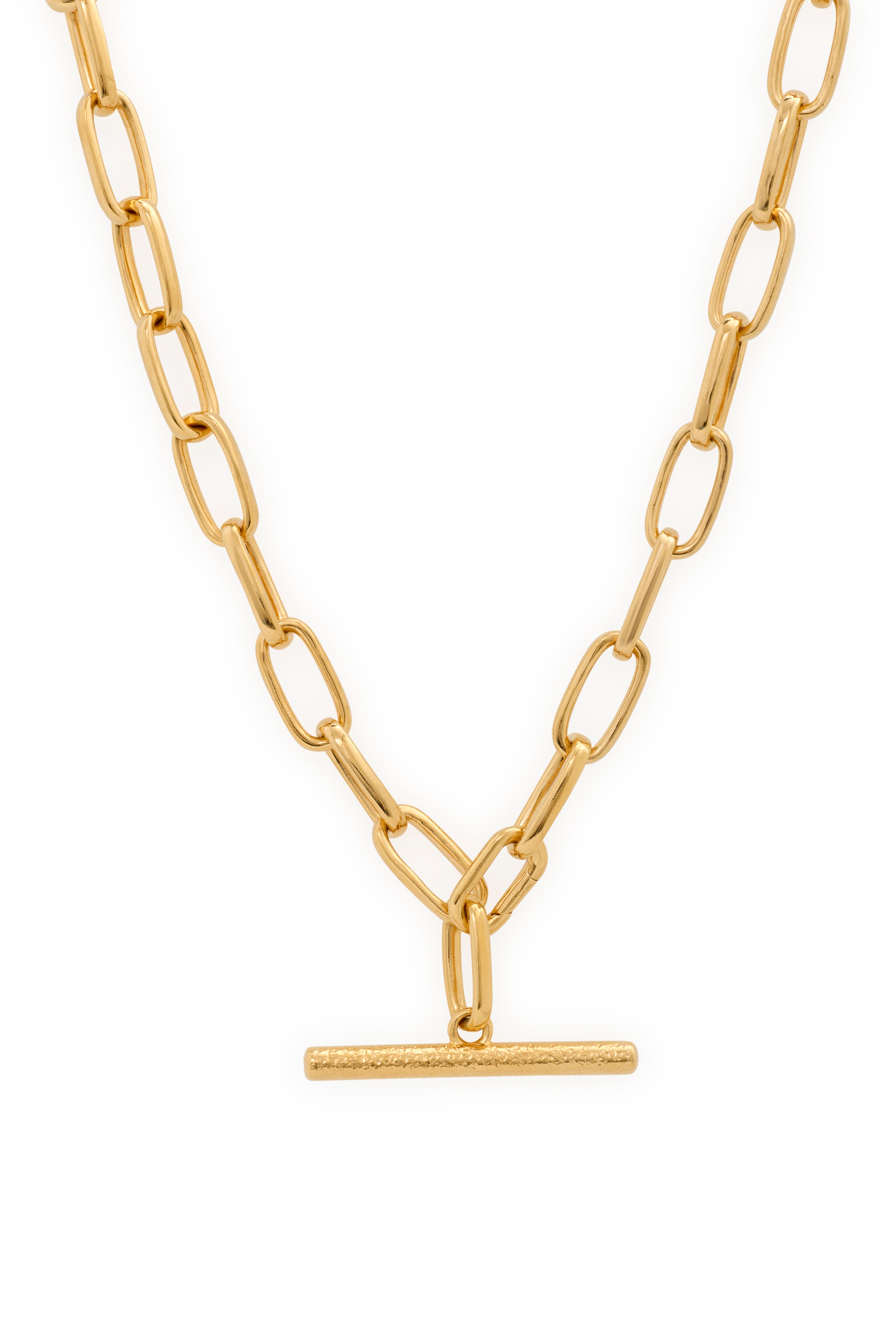 Minimal form, tactile detail. This gold chain carries a bar pendant with a hand-textured surface — subtle irregularities that catch the light and reveal the maker’s touch. The smooth chain contrasts softly with the raw texture of the pendant, creating balance between polish and imperfection.