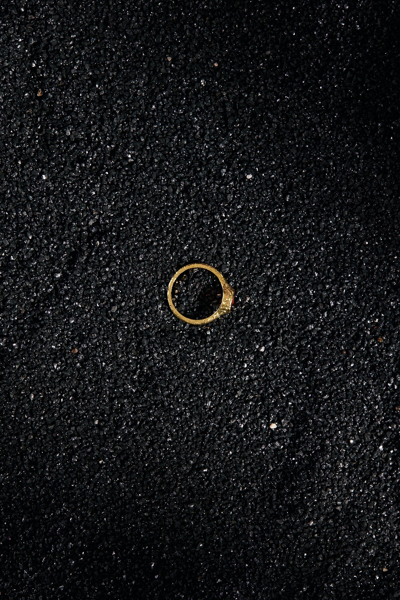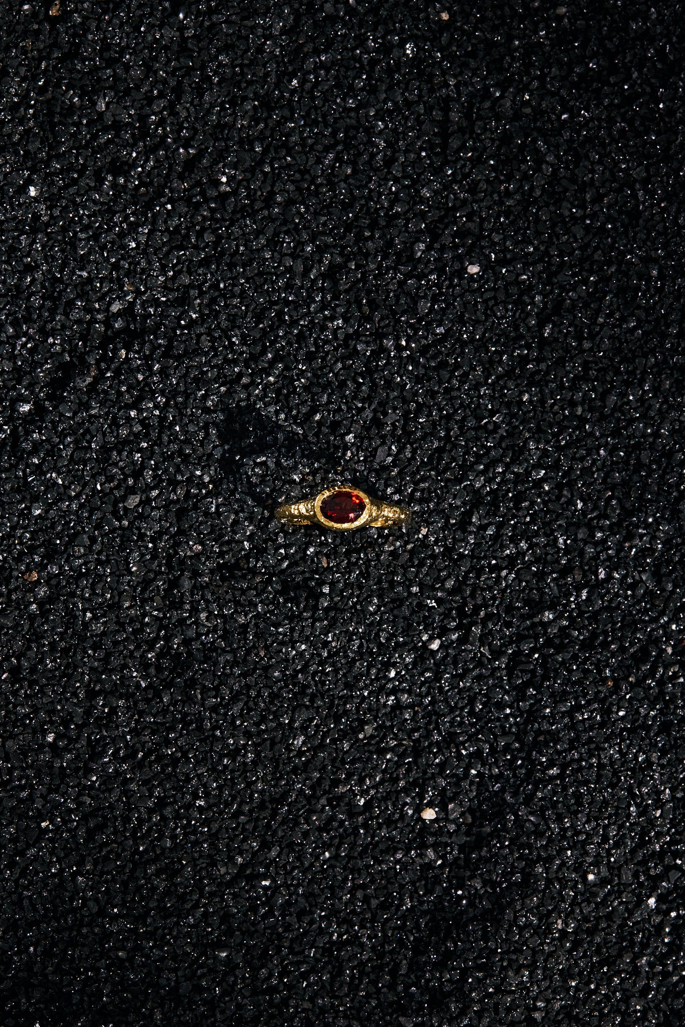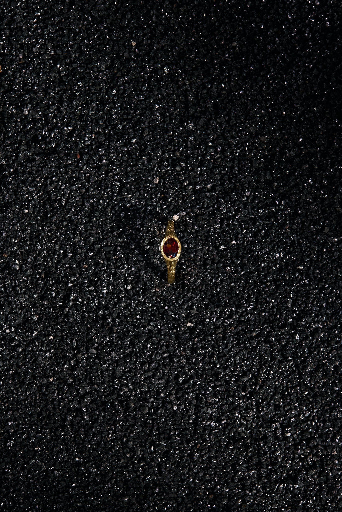 A statement piece built on contrast — refined shape, raw surface, and a bold centre stone. This engagement-style ring is crafted in gold, textured all around to create a softened, organic finish. Set atop sits a large garnet, its deep red tone reflecting warmth against the irregular surface of the metal.