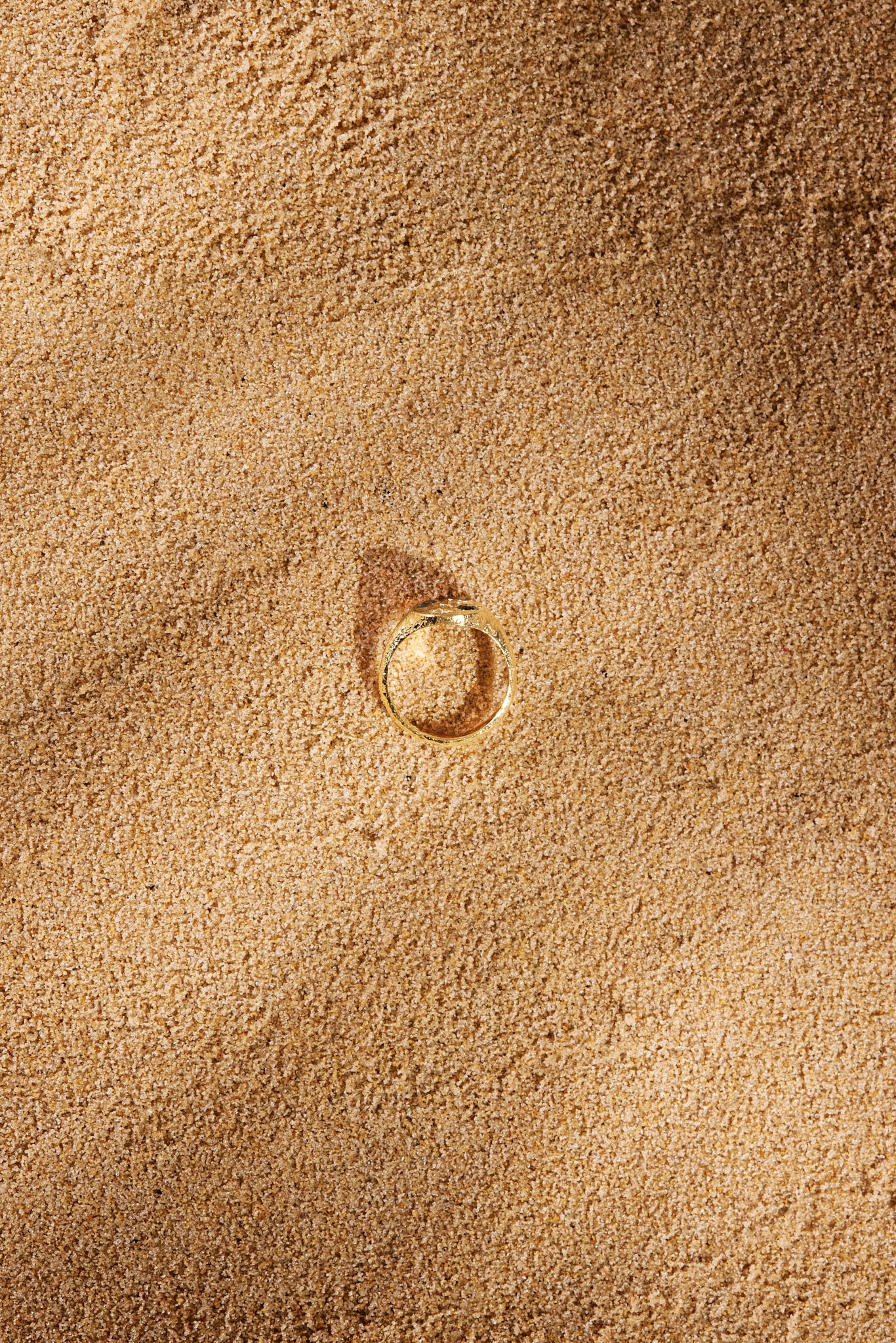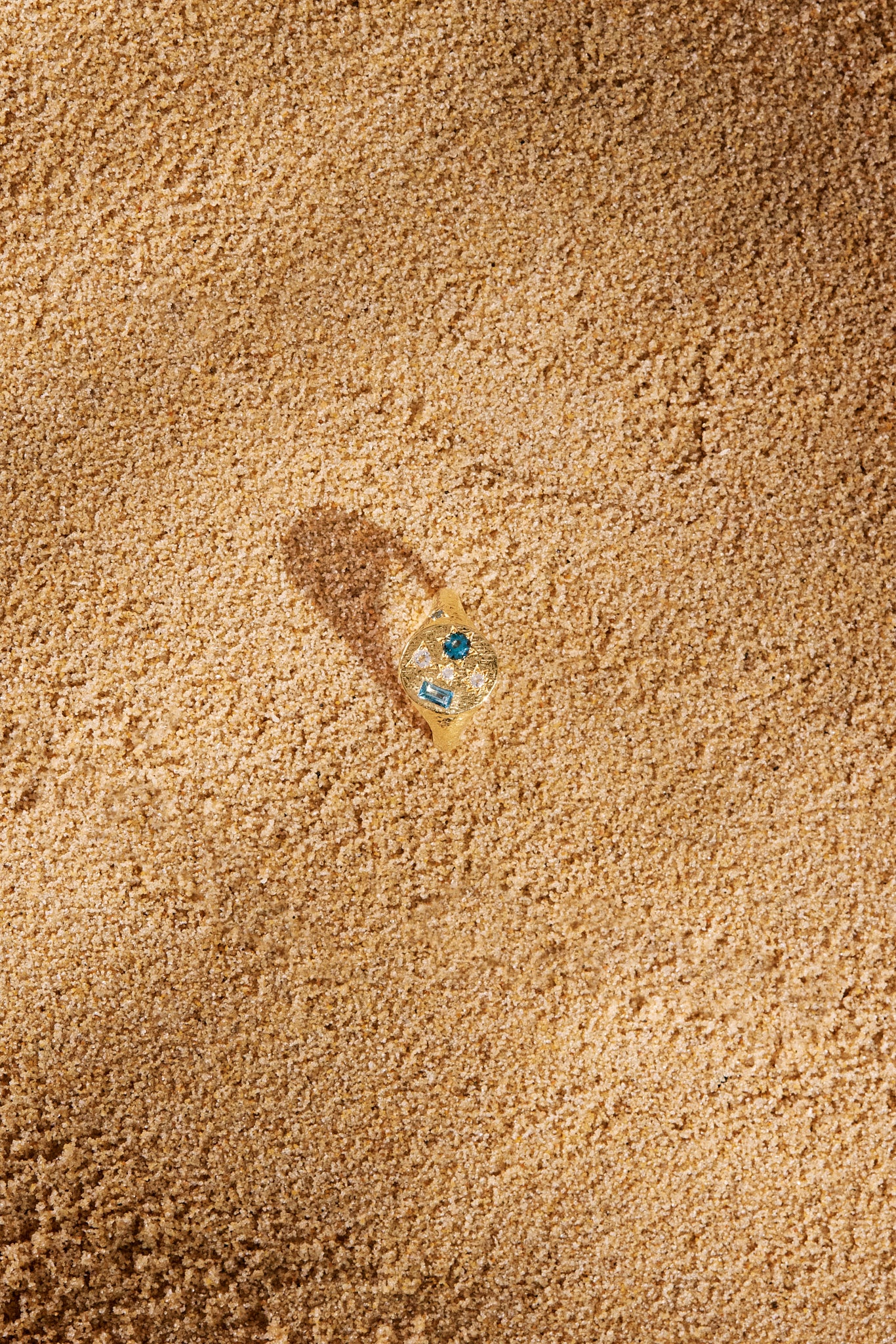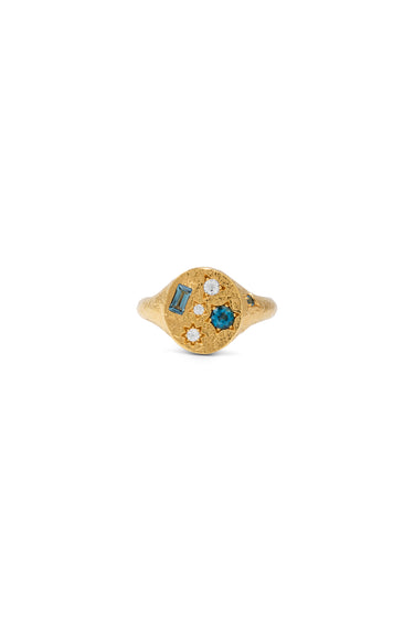 A composition of texture and light. This circular gold signet ring is defined by its softly textured surface and scattered arrangement of stones set across the top. Each gem is placed with intent yet irregular in spacing — creating movement and depth as light shifts across the ring.